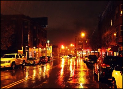 What a difference a few hours can make. The above photo is looking skyward to beautiful clear skies, and the below is earthbound in torrential rain. The top photo I took this morning on my way to work. I was about to enter another busy day and stopped for a moment and straddled my bike to take a few deep breathes while looking skyward. And this evening, on my way home from the gym, I got caught in a heavy downpour. It was one of those rains where rather than trying to duck out of it (I was on a bike after all) it is easier to simply surrender to it. And at one point I stopped to snap a couple photos of the reflections of color in the wet street.