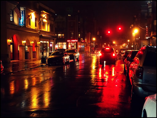 It has been unseasonably warm the past few days…a high of 63f/17c today and as I type these words at nearly 10pm it is still 48f/9c. Odd. But it is supposed to get cold again in the next couple of days. Anyhow, rather than snow it has been raining. And it’s interesting that when I owned a car, on a night like this I would have likely taken it rather than ride in the rain. But being car-free I have a few options: ride, walk, take the bus, or stay home. So I rode. Rain is no longer my nemesis. I love how the wet streets reflect light, giving the entire scene an unnatural glow. I took both of these photos on Allen Street on my way home from the health club this evening using my pocket point-and-shoot camera. I’ve been calling this series The view from My Handlebars for a while because that’s what it is. I was straddling my bike as I looked out over my handlebars and this is what I saw.