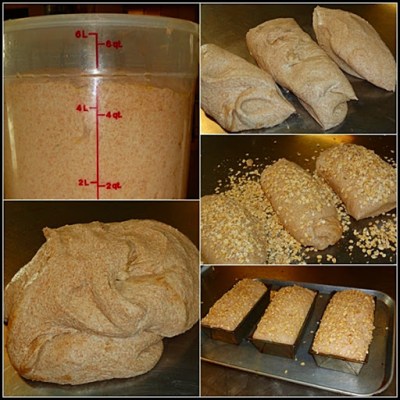 Separate the ingredients into two bowls using this ratio: In one bowl combine 4 cups of flour, two cups of oatmeal, the wheat gluten, and 2 ½ cups of water; stir until just combined. In the second bowl combine the remaining 2 cups of flour, 1 tablespoon of yeast, and 1 cup of water; stir until just combined. Cover the bowls and allow the ingredients to rest and begin fermenting for at least an hour, but up to 12. Then combine the contents of bowl bowls into the bowl of an upright mixer fitted with a dough hook. Add the remaining tablespoon of yeast, along with the olive oil, maple syrup, and salt. Knead the dough on medium speed for about 8 minutes, then cover and allow to rise for one hour. Transfer the dough to a work surface, cut it into two or pieces, gently shape it into loaves. Dust the counter with extra oatmeal and roll the loaves in it, gently pressing oatmeal into the surface of the raw dough. Place the loaves into oiled loaf pans, cover with plastic wrap, and allow to rise for 45 minutes. Preheat an oven to 425F. Bake the bread for about 30 minutes, or until golden brown and sounds hollow when tapped on. Remove the bread from their pans and allow to cool for 10 minutes before slicing.