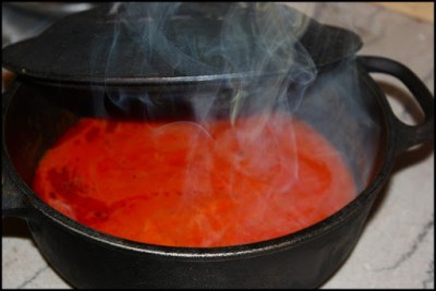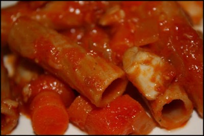 Pasta with seafood…yum! It is one of my favorites. And Fra Diavolo is likely my all-time version of seafood pasta. It’s name–Fra Diavolo–translates from Italian to “Brother Devil,” and the dish has a somewhat interesting history (to read about it go to this post). This recipe can be made with nearly any seafood and any shape pasta, so long as the other ingredients are involved…tomato sauce (I still had a pint of sauce in my freezer from last summer’s tomatoes), hot peppers, anchovies (yes anchovies!), and red wine. The recipe listed below includes penne and halibut, but the one pictured–the one I ate for dinner tonight–was made with tilapia and ziti. This is delicious, healthy, and really easy to make. Anyhow, if you’d like to see additional pictures of (variations) of this being made, click here or here.