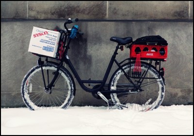 On the bike…a cardboard box and plastic soda crate containing a gym bag full of wet clothes and nearly $70 in groceries (is it just me or have groceries become really expensive in the past year?).