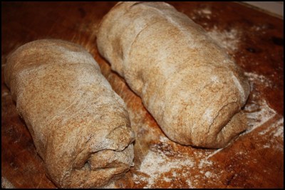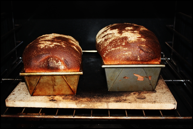 Bake the breads for about 30-40 minutes, adding steam to the oven a few times (either with ice cubes or a spray bottle) and rotating the breads every ten minutes. The breads are done when they are dark brown and sound hollow when tapped upon. Remove the breads from their pans and allow them to cook on a wire rack for at least 10 minutes before slicing.