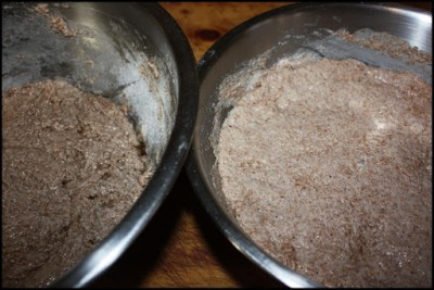 In one bowl make a preferment by combining 2 cups of whole wheat flour with 2/3 cups water and 2 teaspoons of instant yeast. Begin the autolyse in another bowl by combining 4 cups of whole wheat flour, two tablespoons of vital wheat gluten, and 1 3/4 cups water. Stir each bowl just enough to combine the ingredients, taking care not to get yeast into the bowl with the autolyse. If the contents in either of the bowls need more water, add a small amount. Cover both bowls and allow to rest and ferment for 30-90 minutes, during which time the preferment will begin it’s job multiplying yeast and fermenting flour, and the autolyse will soak the grain, swelling the gluten.