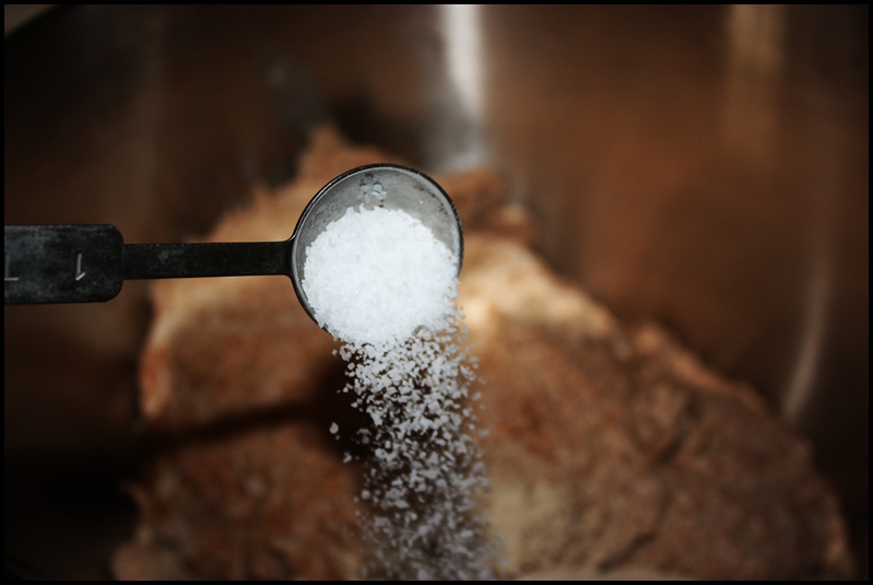 After the alotted time, combine the contents of both bowls into the bowl of an upright electric mixer that is fitted with a dough hook. Then add another tablespoon of yeast…