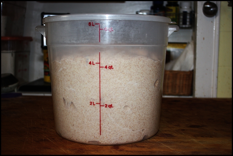 This bread is by far the most common bread that I make…it’s my everyday bread. It is exceedingly easy to make, and good for you. It takes just a few basic ingredients and a few hours of your time (with minimal effort). Below are pictures and the very basic directions on how to make it. To learn more about this recipe (and a couple others) and on the ingredients symbiotic relationship, read this article which I wrote for Artvoice a while ago. So here we go…