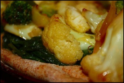 I bake bread about once a week, sometimes more frequently. And most often it is made with whole wheat flour. Sometimes the bread making coincides with dinner time, as it did tonight. So after the first rise I will sometimes pinch a piece of the dough off and make a small pizza for dinner as well…hence the two (loaves) plus pi (pizza pie). And often I will quite literally put whatever I happen to have in the fridge on the pizza. If you really think about it, what is pizza? It’s nothing more than flat-bread with stuff on it. Tonight, for example, I found small container of cooked spinach, and a half head of both broccoli and cauliflower. So I cooked everything aglio e olio (seasoned with plenty of aglio and hot peppers), topped topped it with cheese and baked it. I ate it with a small salad while I baked the two loaves of bread. It was one of the most flavorful pizzas I’ve had in quite a while. Sometimes it’s the simplest concoctions that turn out the best. To make this pizza crust use any of the whole wheat bread recipes found here. And to see how to cook virtually anything aglio e olio, see these links. And in the meantime…make some dough and put some stuff on it…