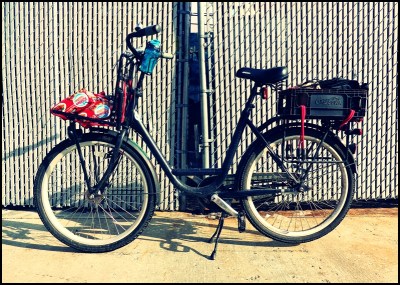 On the bike…10 pounds of dog food, a camera bag with an extra camera and charger, 3 pounds of diced lamb meat, a bottle of fish oil (pills), and a canvas book bag containing a book, a pocket-sized Bible, and a journal.