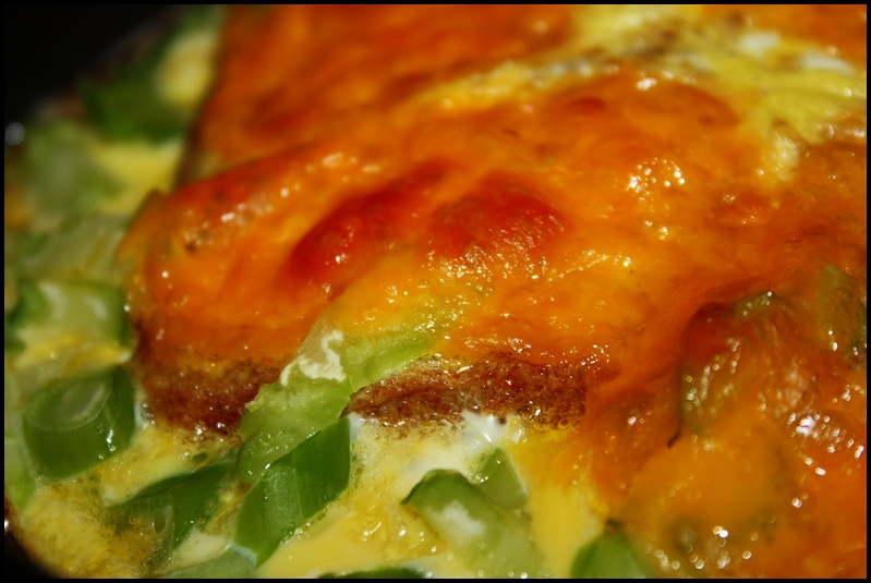 Okay. Firstly, let me explain what this is. And by this I don’t mean classically (in the culinary world) but what it was to me; what it was for my dinner tonight. It was…well…a sort of look-in-the-fridge-and-make-make-something-out-of-it meal. Like much of the east coast we got hit with heavy snow today and I didn’t feel like going shopping after work. My son was out so I only had to cook for myself. So I checked my kitchen and I found some eggs, bread, onions, garlic, cheese, and a few broccoli stems (I ate the florets from them a few night ago). So this is what I made. A strata (culinarily speaking) is a cross between a frittata (or a quiche with the crust on the inside) and a sort of savory French toast. Interestingly, the French word for French toast is “pain perdu,” or lost bread, indicating the bread is stale and cooking it in that manner is a way of reclaiming it (or at least not wasting). And that’s exactly what this was tonight. This was really good and satisfying, and as far as the ingredients the sky really is the limit (but the contents of your fridge are the real limit). Anyhow, this couldn’t have been easier to make, and it hit the spot…thought I’d share the recipe.