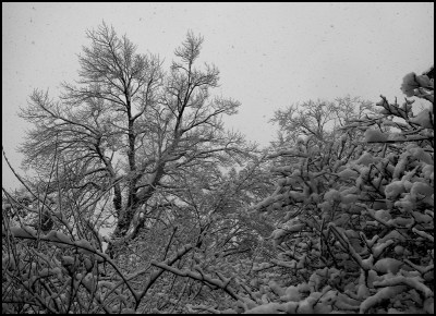 Western New York got hit with heavy snow today, but not nearly as much as our friends on the eastern seaboard. It wasn’t that cold so the snow was heavy–big heavy flakes–and it stuck to everything, including the trees. This type of snow (the heavy, wet stuff) I find is easier to ride a bike in…the tires have more traction than when it is light and really freezing. This is when it’s fun…
