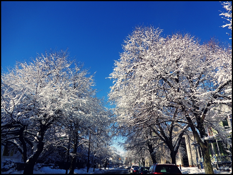 This morning’s ride was incredible. It’s only a couple miles to church (where I was heading) and the sky was cloudless. With warm(ish) temperatures and not a breeze in the air, the snow still clung to the trees from the storm. And with the warmer temps today the snow is all but gone on the trees now. But this morning it was like riding under a canape, and there was no where else I would have wanted to be than on a bike pedaling and coasting beneath it.