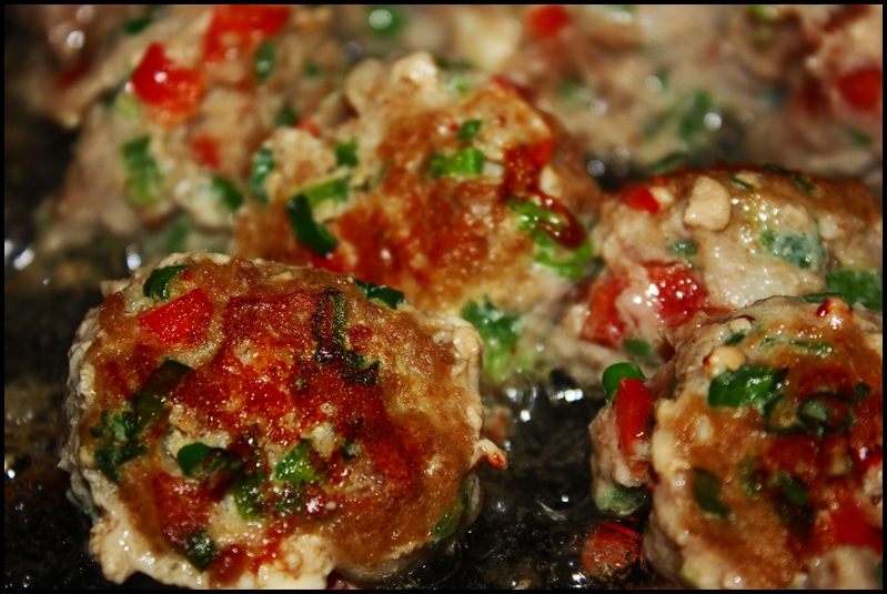 Turkey Meatballs with Red Pepper, Green Onion, Jalapeño, and Feta