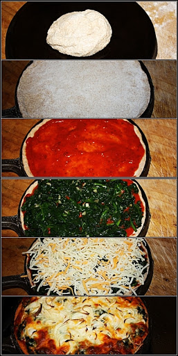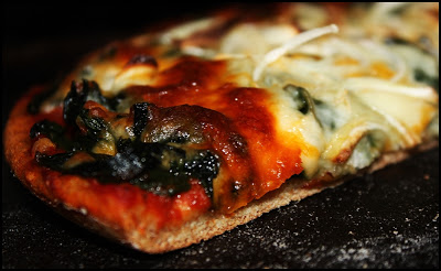 This evening I made a couple loaves of honey-whole wheat bread, and as is sometimes the case–like tonight–I pinched off a piece of the dough to make a pizza for dinner (some believe that this was actually the origin of pizza…the bakers made themselves a little something to eat while the rest of the bread rose). Anyhow, I looked in my fridge and saw that I had a small bag of fresh spinach, so I cooked it with oil and garlic (no surprise, right?); to see how to do this click here. I also layered the pizza with tomato sauce and three cheeses. And lastly I topped it with a layer of thinly sliced raw onion, which caramelized nicely as the pie baked (yum). Anyhow, the recipe for the bread is below. If you want to see it being made–with step-by-step instructions–click here. The recipe listed is with maple instead of honey, just substitute with honey (the maple would have too strong of a flavor for pizza). It makes two or three loaves…or two loaves and a pie. This is just a suggested recipe, use your imagination and put on it what you happen to have in your fridge…or at least what you really like. You may be surprised how good it is.