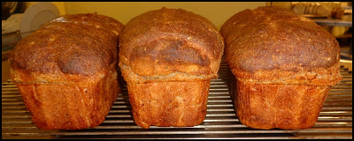 Bake the breads for about 30-40 minutes, adding steam to the oven a few times (either with ice cubes or a spray bottle) and rotating the breads every ten minutes. The breads are done when they are dark brown and sound hollow when tapped upon. Remove the breads from their pans and allow them to cook on a wire rack for at least 10 minutes before slicing.