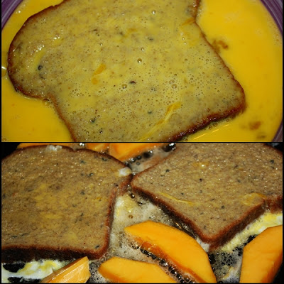 While the syrup is simmering mix together a couple eggs with a tablespoon or two of milk. Soak the bread for a few minutes and then cook it on both sides (in a tablespoon or two of butter and oil). Add the fruit to the pan as the taost cooks and caramelize that as well.