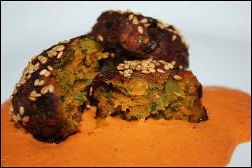 Chickpea and Haricots Verts Falafel with Spicy Roast Pepper Taratoor Sauce (Yum!)