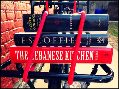 Three large cookbooks, a dough bucket containing a double batch of Honey-Oatmeal dough, and a canvas book bag containing–among other things–a spare camera, a periodical, and a small Bible.