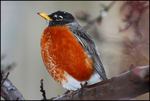 When I left work today cold air was blowing out some of the warmer air we had yesterday, creating some fog. As I rode home I could see the top of our city hall shrouded in fog and thought it would make an interesting photo. So after stopping home I rode downtown. But by the time I arrived most of the fog had lifted and it had given way to a rather heavy rain, but I thought I’d still take a couple shots. I had my camera bag wrapped in plastic, and I walked the bike under a tree for cover from the rain to get a camera out (it was unsuccessful…I still got wet, but protected the camera–mostly–by holding it in my jacket. Anyhow, as I was wrestling with the plastic bag I glanced up in the tree and there–just a few yards from me–was the bird you see in the below photo. It seemed to be posing for me. That was the real prize. I snapped a few shots of it before it flew away. It made the short ride in a heavy rain worth it.