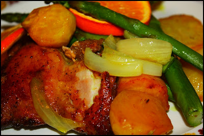 I first marinated a pound of boneless, skinless chicken thighs in a couple tablespoons of Lebanese seven spice mix and a pinch of salt. While the chicken was marinating and the oven was preheating, I peeled sliced/diced the rest of the ingredients. In addition to the chicken I also used golden beets, asparagus, a potato, onion, and whole garlic cloves. When the oven was hot I heated a large cast iron skillet over medium-high heat with a few tablespoons of olive oil. When the oil was hot I added the chicken first and browned it on one side. After turning the chicken over I pushed it to one side of the pan and placed the beets, potato, onion, and garlic in the available space. The I placed the asparagus and sliced orange on top (the image below is the recipe just prior to going in the oven). After a small sprinkling of salt and pepper over everything, I placed the pan in the preheated oven. After about ten minutes I looked in on it and it looked fine but wasn’t done yet, so I cooked it for another ten minutes. At this point everything was thoroughly cooked and caramelized. Intensely flavored and cooking in their own juices, this recipe was so delicious a sauce was not necessary.