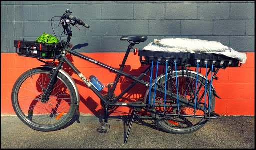 #479 (above)…a cardboard box containing 3 loaves of freshly baked chickpea turmeric bread, a camera bad containing an extra camera and two lenses, a canvas bag containing a few books and an electronic reader, and an empty dough rising bucket.