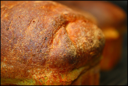 Bake the breads for about 30-40 minutes, adding steam to the oven a few times (either with ice cubes or a spray bottle) and rotating the breads every ten minutes. The breads are done when they are dark brown and sound hollow when tapped upon. Remove the breads from their pans and allow them to cook on a wire rack for at least 10 minutes before slicing.