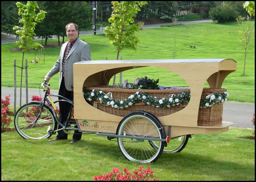 If you’ve visited this blog before then you know my interest in bicycles as not just a vehicle from which to get from point A to point B (though for this they are extremely useful) but also as human powered machines that do things. I’ve of course showed all sorts of things that can be carried on bikes, and have profiled military bikes, bicycles as ambulances, mail bikes, and even a taco bike. And now here is a tricycle hearse. Nice. Morbid, you may think? I disagree. We’re all going to end up on the other side eventually so why not let our last ride be a leisurely one powered by a fellow human. To read a full story about this, click here. To go to the site of the funeral home where Funeral Home Director Wade (pictured) pedals people to their final resting place, click here.
