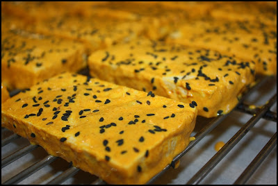 Remove the tofu from its package and drain it. Place it between two plates to allow the weight of a plate (or two) to press out additional moisture. Drain the tofu again and slice it into ½ inch slices, then lay it on a baking sheet. To make the marinade, combine the yogurt, lemon, garlic curry, turmeric, hot pepper, cumin, and salt. Mix the marinade, then pour it over the tofu, gently turning it to coat all sides. Preheat an oven to 400F and allow the tofu to marinate at room temperature for 10-15 minutes. Transfer the tofu to a clean baking sheet that is fitted with a wire rack (if you have one, otherwise place it directly on the baking sheet but lightly oil it first). Sprinkle the sesame seeds across the tofu and bake it for about 20-30 minutes, or until firm and slightly crisp (rotate the pan every 5 minutes or so for even cooking). This is delicious on a sandwich, salad, or as a simple snack; it can be eaten hot, room temperature, or chilled.