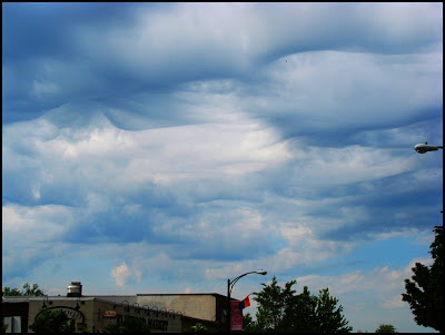 I find this stuff fascinating. Clouds, stars, atmosphere… you get it. Anyhow, I saw these cloud formations as I pedaled to the health club tonight. They look really good in the photos but in real life they were breathtaking. They quite literally stopped me in my tracks a few times (when I took these photos). I thought they might be the somewhat new cloud formation that I had heard about (first new one to be categorized since 1951) and sure enough when I arrived home and looked them up they fit the description. The phrase Undulatus Asperatus translates from the Latin as “rough waves.” I heard others describe them as like looking at waves from underneath them, and that’s exactly what it was like…these incredibly beautiful slow moving cloud-waves rolling past. Then, as quickly as they appeared they were gone, returning to greyer and less wavy clouds. To see a photo of mammatocumulus (mammary clouds) I took .last spring, see this post.