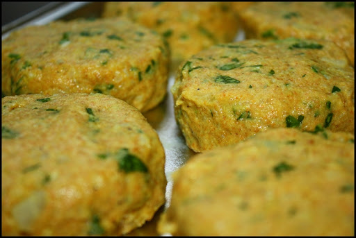 (Potato and Bulgar Wheat Patties with Broccoli Cheddar Stuffing and Lentil Sauce)