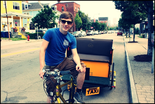 Most cities have them, and as of the past few years so does Buffalo. I’m talking about human-powered taxis, of course. That’s Landon pictured above, owner/operator of the Allentown Pedicab Company, the newest pedal taxi company in our city. I first became aware of him when I saw an article of him and his small company on Buffalo Rising. I figured I’d eventually see him as he is based in the same neighborhood in which I live, and tonight I did. Speaking with him briefly, I found out that he built the trailer himself and that business is good. Anyhow, I thought I’d highlight someone local with a pedal powered business. If you are in the area and need a cab but don’t want to burn fossil fuel this may be your ride. If you want to make a reservation here’s his website.