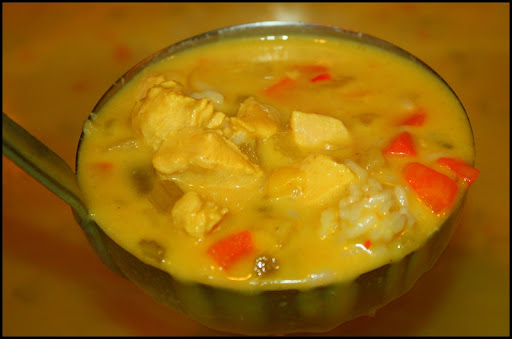 Before I talk about the recipe I have to make a few other comments. You may be wondering why on earth this guy would be posting a recipe for soup in the middle of summer, or at least early summer. Nonetheless, it’s hot outside. Well, the answer to this is twofold…one is that it was on the menu where I work (so I had to make it), but also because I really enjoy this soup. But the less obvious reason (to most, I think) is that even though spicy food is often thought of as “warming foods” for cold weather, spicy foods originate in hot climates and are naturally eaten there. Spicy foods, in fact, act as a natural air conditioner of sorts…they make you sweat which cools you off. Spicy foods are also known to stimulate the appetite, which may be lacking during steamy weather (interesting how nature takes care of us). Anyhow, mulligatawny is a curried chicken and rice soup of British-Indian origin. It is really easy to make and really delicious (it freezes well also, in the even you make too much of it). The recipe below is a basic one; when I make it for myself I add more hot pepper or a splash of hot pepper sauce. It is, without doubt, a meal in itself.