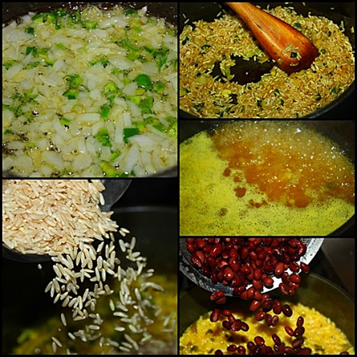 Heat the oil in a small sauce pot. Add the onion and sauté for a few minutes, then add the garlic and cook it for another minute or two. Stir in the rice, then the broth and salt. Bring to a boil then lower to a slow simmer. Cover the pot and simmer simmer the rice for about 30 minutes. Add the beans (just lay them on top of the rice; do not stir at this point). If it looks as if too much liquid has evaporated add more. Cover the pot and simmer for another 10 minutes. Remove the pot from the heat—leaving it covered—and allow it to rest for another 5 minutes or so. Remove the lid and gently fold in the beans.
