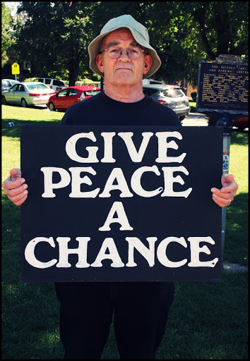 That’s Howard pictured above (or is it Harold…sorry I am not that great with remembering names). He is one of a number of silent peaceful protesters that I see standing at the intersection of Elmwood and Bidwell each and every Saturday…rain or shine, snow or cold. They’ve been doing this for years. The women not pictured, who are standing to his left, are part of the Women in Black movement. I can’t tell you how many times I’ve ridden past them. So today as I did so I decided to stop and say hi and thank you. I really believe that peaceful measures are our only hope if we, as a species, choose to survive (yes, it is our choice). We really need to give peace a chance. Anyhow, this post is to them…the peaceniks on the corner who are stand up for what the believe…