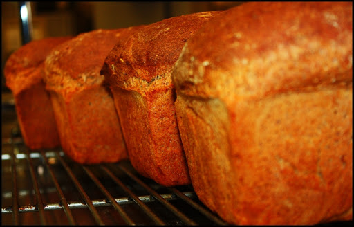 Bake the breads for about 30-40 minutes, adding steam to the oven a few times (either with ice cubes or a spray bottle) and rotating the breads every ten minutes. The breads are done when they are dark brown and sound hollow when tapped upon. Remove the breads from their pans and allow them to cook on a wire rack for at least 10 minutes before slicing.