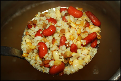Boil the grains in the water in logical succession according to cooking times: first the white and red beans (about 60 minutes), when they are soft add the, spelt berries, lentils, and barley (about 30 minutes); lastly, add the millet and bulgar (about 10 minutes). The key is that after each addition the previous grain must be soft enough so that when all of the grains are in the pot they will all be equally soft; undercooked grains (especially the beans) can really ruin this bread. And as the grains cook add more water to the pot as necessary because the cooking liquid, which is full of nutrients, will become part of the recipe (keeping a lid on the pot will slow it’s evaporation). After the grains are cooked allow them to cool in the liquid to room temperature, refrigerating if necessary. After the grains are cooled drain them, squeezing them with your hands or the back of a spoon, reserving the cooking liquid.