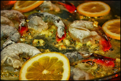 Dredge the shrimp in the flour. Heat a skillet with the butter over medium high heat. When the butter is melted and begins to bubble add the shrimp. Cook it for a minute or so on one side, then turn it over and add the garlic. Stir and shake the pan gently. After another minute add the lemon, wine, and salt. Simmer the shrimp for a couple minutes, or until cooked and the sauce has thickened slightly, then stir in the minced parsley. Serve with rice pilaf or over pasta.