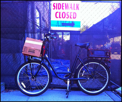 On the bike…a cardboard box containing other boxes full of food on their way to a local food pantry.