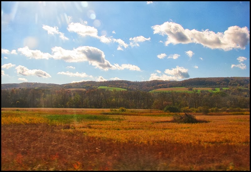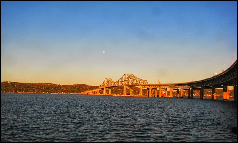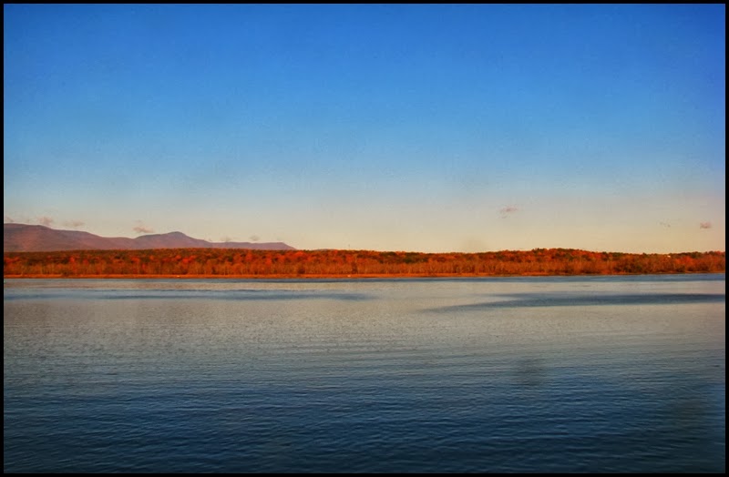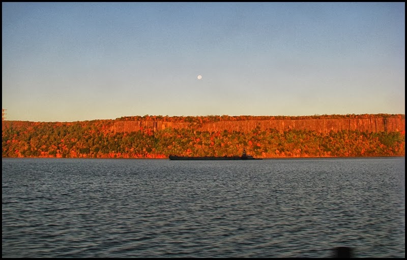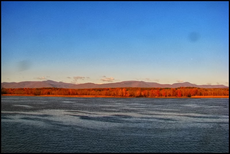 So I took the train home from NYC today. I’ve taken this train numerous times in my life and I still enjoy it. I’ve also posted pictures of this trip on other occasions, but not since last year. I was not going to post any–or even take any photos for that matter–until the train got rolling. Then I saw the autumn colors and couldn’t help myself…a constant moving panorama before my eyes as I relaxed and watched NY State go by. The route this particular train takes, as you may already know, begins in NYC and hugs the Hudson River up to Albany, the state capitol. There, after changing engines, it turns left and follows the Erie Canal to Buffalo, then crossing the border at Niagara Falls, and continuing on to Toronto. One of my favorites of these photos is the first one above, which is one of the first I shot this morning (the photos are in chronological order). It was about 7:30am and the sun had only been up for about an hour. As the train traveled north on the Hudson there was still the full moon hanging in the sky, just above a cargo ship. It was, I thought, pretty as a picture, so I took a photo of it. Click any for a slightly larger view.