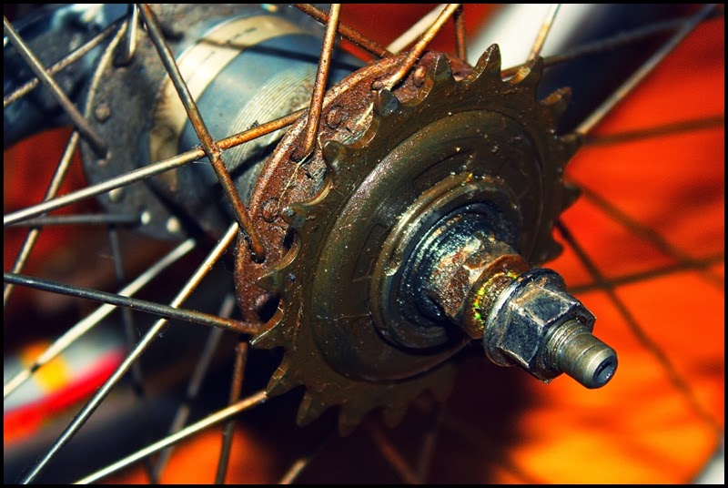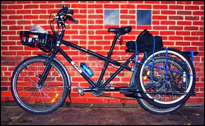 A few groceries. A gym bag full of wet clothes. The rear wheel off my Torker Cargo-T (having a spoke replaced at the local bike shop), and also general maintenance…a cold, windy, rainy day is a great bike repair day.