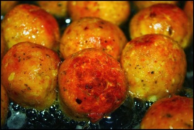 So I’ve mentioned before on this blog that while I am not a vegetarian I do not eat a great deal of meat, and there are plenty of days when I simply do not want any. Today was one of those days. These chickpea balls are definitely not a replacement for meatballs because they taste and feel nothing like a meatball that is made with meat. But, on the other hand, these are really delicious and very satisfying. They are also exceedingly easy to make. After searing they can be baked in an oven and served as an appetizer with any number of dipping sauces, or–as I did tonight–they can be poached in tomato sauce and served with pasta. Either way they are simple and delicious. The recipe is below.