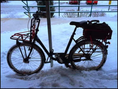 The next three images below were taken this morning on my way to church and after arriving. The bottom of the three shows my bike locked up once arrived at our church parking lot…note that even the bicycle parking was shoveled. Our little church welcomes everyone, I thought to myself as I was locking up the bike (and we mean this literally)…even half-crazy middle-aged guys who ride their bikes in the snow.