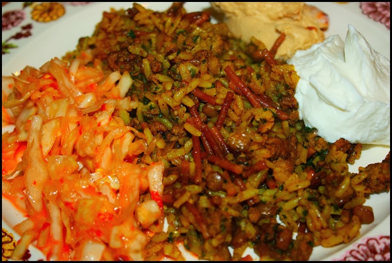 Sometimes I just have to cook for myself. I really do. I cook all day for others and sometimes it just feels food to cook for me. Anyhow, this is what I had for dinner tonight (click any of the highlighted words for recipes)…moudardara with lamb (rice with lentils and vermicelli), hummus, labna (yogurt cheese), and kabis malfouf (spicy pickled cabbage). For more Lebanese-inspired recipes, click here.