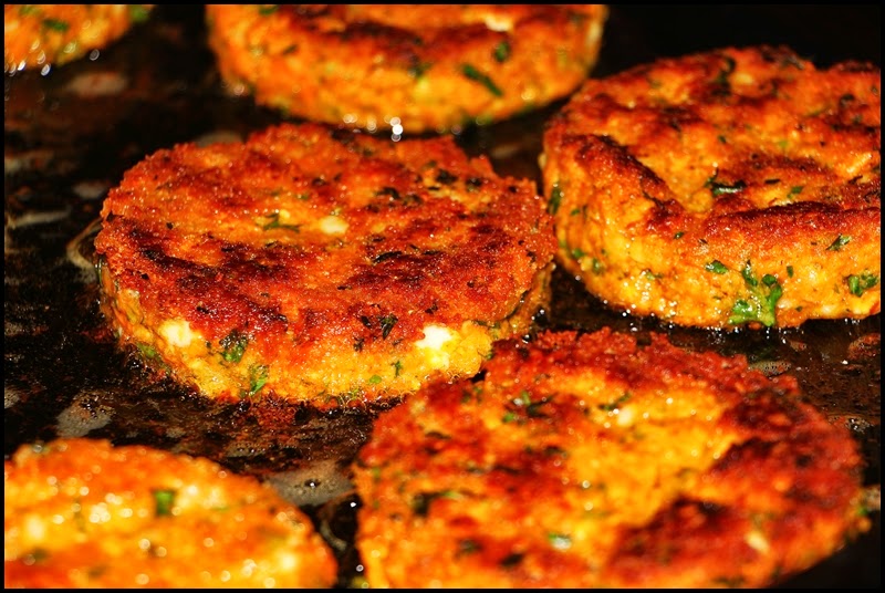 So first a couple things. When you are in Buffalo chicken wings are not referred to as “Buffalo Wings,” they are just wings. The first time I heard the term was, I think, in 1985 while at culinary school (of all places). To read an article I wrote on wings and all things “Buffalo Style” click here. Anyhow, these burgers are a play on that recipe in that while there is no actual chicken (I should have used chickpeas) there is Frank’s Hot Sauce, blue cheese. celery, and carrot. And this is really a variation on a theme of meatless burgers I’ve been making for staff lunch at work (for recipes of other versions of this click here, here or here). Anyhow these are really delicious. Eat them as a burger on a bun or between two slices of bread, as an entree as a sort of meatless “steak,” or as I did today and crumble one over a salad. And yes–before you ask–these can be baked rather than pan-fried but they wouldn’t have the same crispiness. And they can be made vegan by omitting the cheese and eggs (and cutting back on the bread crumbs) but the flavor profile would change without the blue cheese.