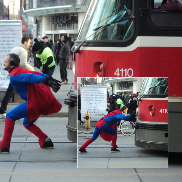The top photo is a sign that greeted me as I drove my truck into the underground parking garage of my hotel (sometimes I bring my Dahon folder with me, but not this time). The photo on the left is a picture of a bike I saw parked on Bloor Street…it captured my attention because it looks like a bike that I would ride if my child were still young; a bike to carry everything you need and still plow through a bitter northern winter (an S.U.B., or a sport utility bicycle.). The pic on the right is a piece of artwork/bike rack made out of a giant bike chain that is at one of the entrances to the Kensington Market. But my favorite is the one below…Superman stopping a streetcar on Dundas and Yonge Streets, just to the left of Nathan Phillips Square.