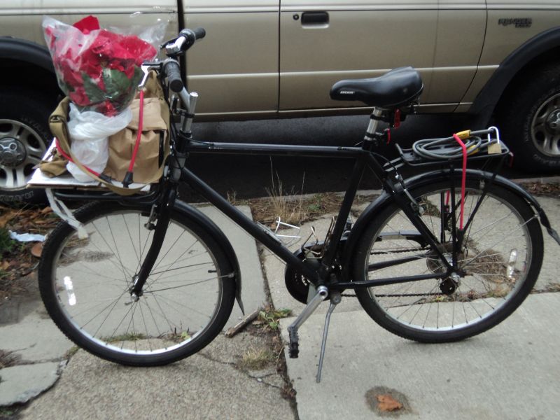 Anyhow, as I was in the first store of my evening ride there was a man there returning recyclables for cash...you know the type, not sure if they are homeless but they are definitely “rough around the edges.” Now I am in no way trying to sound disparaging towards this man because I have a deep respect for people who can partially support themselves by collecting cans and bottles and I think I am a little rough around the edges myself. And truth be told I really question whether or not I will eventually be collecting cans and bottles to buy flour to bake bread (no joke). At any rate, he was on a bike and we both happened to exit the store at the same time. He saw my bike and was immediately taken by it and struck up a conversation about it…how it would be great to have a bike like that to carry stuff, etc. (I concurred). The bike rack where I had it locked to was at the corner of the building and we talked as I loaded and secured the items. In the middle of our conversation he turns away from me, sort of at the corner of the building, pulls out his penis and begins to urinate against the building…he continued to talk as he urinated. Now I’m all about living simply in the city but in a somewhat more dignified manner. And as I pedaled home I said a silent prayer for that man and hoped for myself that while I really feel it’s OK to ride a bike and collect bottles for money at any age, I really hope not to lose touch so much that I urinate on a building in public.