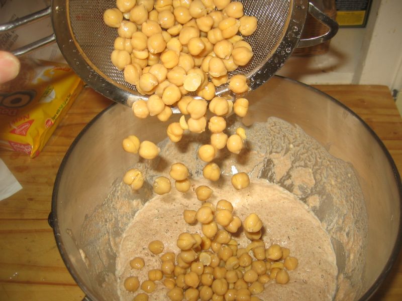 Yes…another bread experiment. This recipe is proof that you really can make bread out of what is at hand. Ever since I’ve discovered Ezekiel Bread I’ve really liked the flavor and texture of adding legumes to bread recipes (click here and here for previous posts on Ezekiel bread…with recipes), thus this is really just a variation of that recipe. In addition to honey and olive oil, I also added a can of rinsed chickpeas straight into the dough…no grinding or chopping, just straight in.