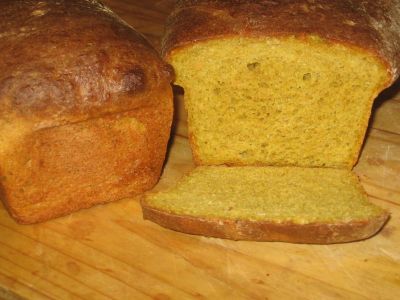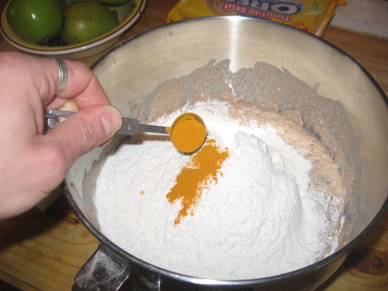I also added a teaspoon of turmeric because it is an incredibly healthy spice. This small amount will not impart much of a noticeable flavor, but it does offer a beautiful yellow color (but the very mild flavor that is present from the turmeric marries perfectly with the chickpeas). The chickpeas, like the grains and beans in Ezekiel bread, mostly mash into the dough during kneading.