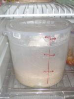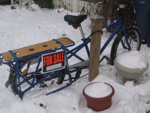 Arrgh! After arriving home and attempting to push the Mundo up it’s plank (this is what I use to get it in the front door…the bike weighs something like 60lbs with nothing on it) I slipped on the snow causing the bike to list a little, which in turn caused the plastic crates to shift and ultimately tumble their contents into the snow before I could correct it. The worst part, I think, is that by the time I had arrived home my fruit was already frozen (the high temp today was something like 15F (-9c).