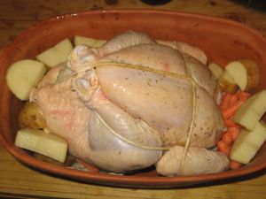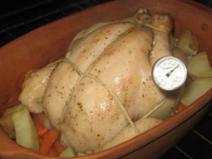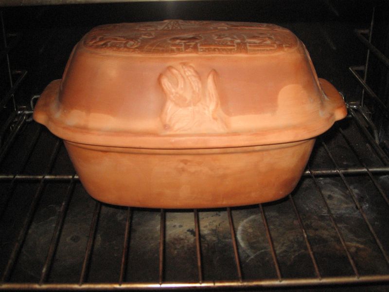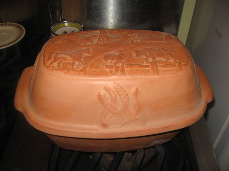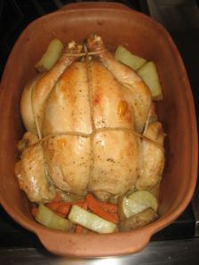 And rather than cooking a chicken in a “traditional pot” I chose, last night, to cook it in a clay pot. The beauty of clay pot cookery is twofold: Firstly, everything is contained to one vessel. And secondly, the meal–no matter what it is–is guaranteed to come out moist and Delicious…the food steams as it cooks…you basically put it in the oven and leave it for a while.