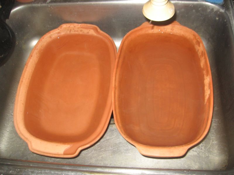 The first thing in preparation for clay pot cooking is to soak the pot in cool water for about 20 minutes. The clay actually absorbs some of the moisture which in turn steams your food as it cooks. I simply open the pot in the sink and fill it with water, transfer it to a counter, and let it soak while I prepare the other items.