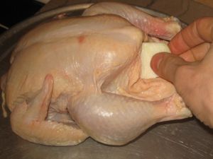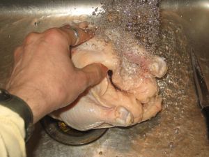 Next, after removing the giblets, wash your chicken inside and out with cold water.